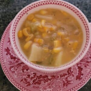 A simple chowder with celery, potatoes and 2 kinds of corn.